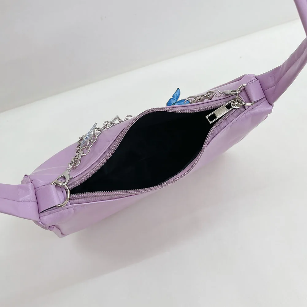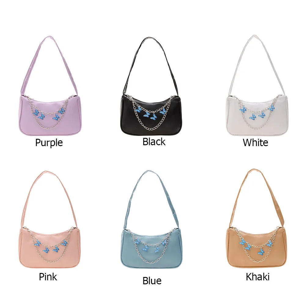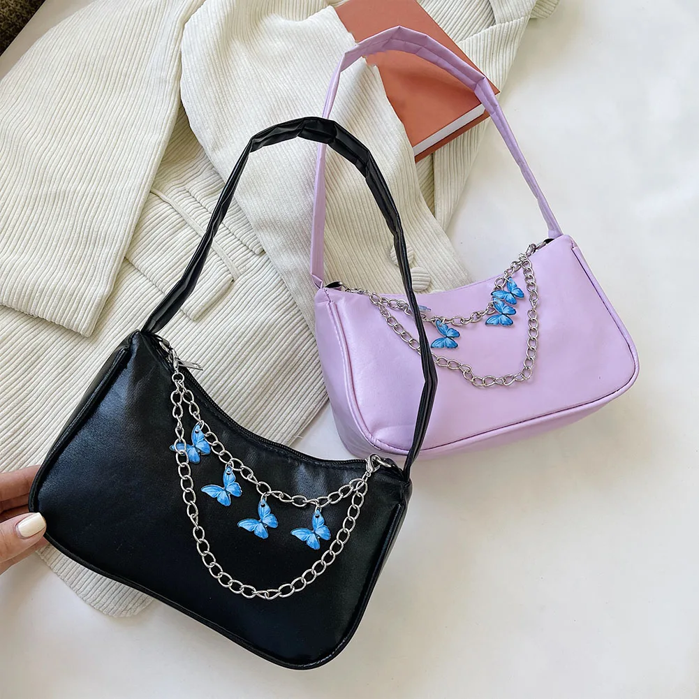 Vintage Women Butterfly Chain PU Leather Shoulder Underarm Bag Casual Solid Color Small Handbag Purse