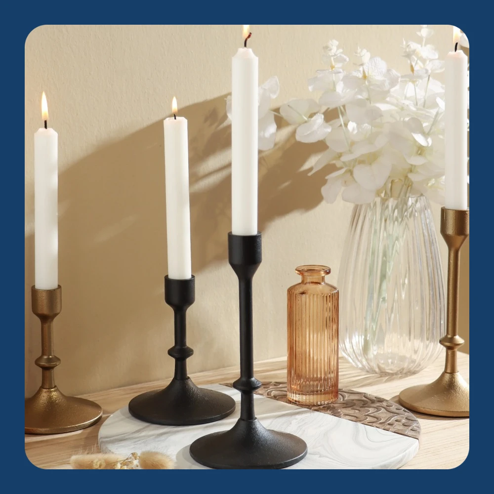 Add a touch of glamour to your tabletop with this metal taper candle holder. Made of cast iron, this candle holder features a sleek satin black finish. The elegant design adds a touch of luxury to any room, and the candlelight shines through, giving off a charming glow. This taper candle holder will add brilliance to your living room, dining table, bedroom bookcase and more, and is the perfect addition to any table decor.