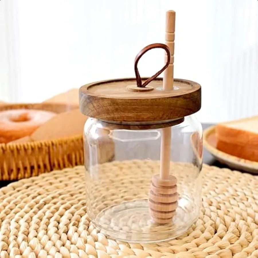 Glass Honey Dispenser with Stick and Acacia Lid Cover Airtight 17 OZ Glass Bottle Honey Jay Sealed Storage Wide Mouth Container